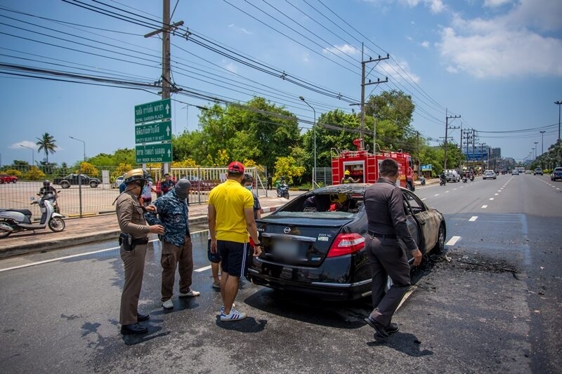 ที่เกิดเหตุพบไฟกำลังโหมลุกไหม้รถเก๋ง ยี่ห้อนิสสัน ทะเบียน 1กศ1461 กทม. ซึ่งจอดอยู่บนช่องจราจรช่องที่ 3 โดยมีเจ้าหน้าที่ตำรวจ สภ.เมืองพัทยา เจ้าหน้าที่เทศกิจเมืองพัทยา มาอำนวยความสะดวกและปิดกั้นทางจราจร ไม่ให้รถคันอื่นเข้ามาในพื้นที่เพื่อป้องกันอันตรายที่เกิดขึ้น เนื่องจากเพลิงที่ไหม้รถมีความรุนแรงมาก เจ้าหน้าที่ต้องใช้เวลาฉีดน้ำสกัดไฟนานกว่า 10 นาที จึงสามารถควบคุมเพลิงไว้ได้ ส่วนตัวรถได้รับความเสียหายจากการถูกเพลิงไหม้ทั้งคัน