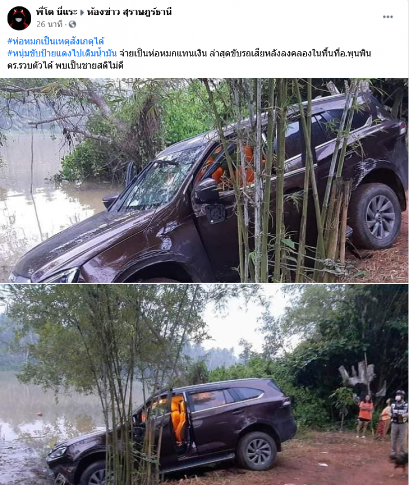 ล่าสุดมีรายงานว่า พบเจ้าของรถคันดังกล่าวแล้ว ซึ่งได้ขับรถเสียหลัก ลงคลอง ในพื้นที่ อ.พุนพิน ตร.สามารถรวบตัวไว้ได้ เบื่องต้นชายคนดังกล่าวอ้างว่าสติไม่ดี
