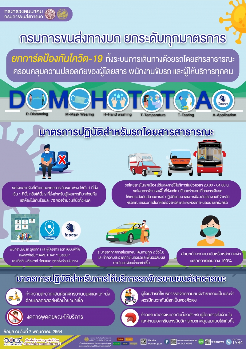 ผู้ประกอบการรถโดยสารสาธารณะ รถยนต์สาธารณะ รถจักรยานยนต์สาธารณะ สถานีขนส่งผู้โดยสาร พนักงานขับรถ ผู้บริการ และผู้โดยสาร เพื่อความปลอดภัยของผู้ให้บริการขนส่งสาธารณะและสร้างความเชื่อมั่นให้แก่ผู้โดยสารที่ต้องการใช้บริการการเดินทางด้วยรถโดยสารสาธารณะทุกประเภท โดยยึดมาตรการทางด้านสาธารณสุข D-M-H-T-T-A อย่างเคร่งครัด และเพื่อให้เหมาะสมกับสถานการณ์ที่ต้องเพิ่มความระมัดระวังขั้นสูงสุด ได้กำหนด การจัดที่นั่งของรถโดยสารประจำทางและรถโดยสารไม่ประจำทาง ให้นั่ง 1 ที่นั่ง เว้น 1 ที่นั่ง หรือให้นั่ง 2 ที่นั่งสำหรับผู้โดยสารที่มาด้วยกันนั่งติดกันได้ ซึ่งต้องมีจำนวนผู้โดยสารไม่เกินร้อยละ 70 ของจำนวนที่นั่งทั้งหมด หรือให้เหมาะสมตามประเภทของพาหนะ สำหรับการเดินรถโดยสารสาธารณะในเขตเมือง ขอให้ผู้ประกอบการขนส่งปรับลดการให้บริการในช่วงเวลา 23.00 - 04.00 น. หรือช่วงระยะเวลาตามประกาศจังหวัดกำหนด