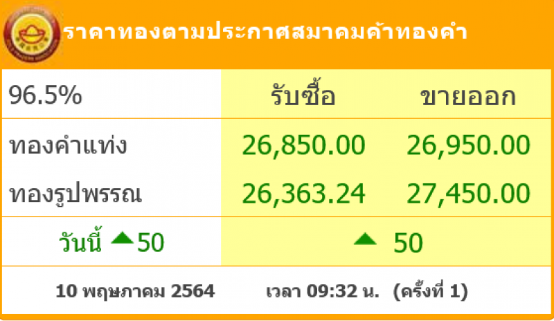 วันที่ 10 พฤษภาคม 2564 สมาคมค้าทองคำรายงาน ราคาทองไทย ครั้งที่ 1 เมื่อเวลา 09:32 น. โดยราคาทองล่าสุดราคานั้น ได้ปรับขึ้นมาอีก 50 บาท หลังจากที่เมื่อวานนี้ ได้ปรับพุ่งขึ้นมา 300 ส่งผลทำให้ราคาวันนี้ทองคำแท่ ง รับซื้อบาทละ 26,850 ขายออกบาทละ 26,950 บาท ส่วนทองรูปพรรณ รับซื้อบาทละ 26,363.24 ขายออกบาทละ 27,450 บาท