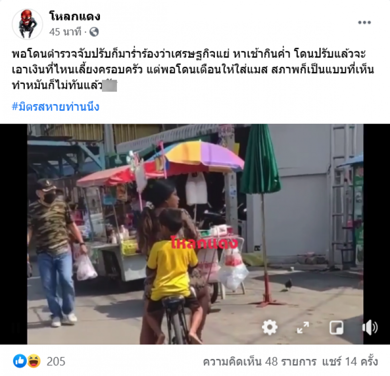 เป็นอีกหนึ่งเรื่องราวที่เรียกเสียงวิพากษ์วิจารณ์อย่างมากในโลกออนไลน์ วันที่ 10 พฤษภาคมเฟซบุ๊กเพจชื่อดัง ได้มีการโพสต์คลิปเหตุการณ์ ขณะที่หญิงรายหนึ่ง กำลังมีปากเสียงกับแม่ค้าในตลาด เนื่องจากว่าทางด้านแม่ค้าได้พูดเตือนเรื่องไม่ใส่แมสก์ ทำให้หญิงคนดังกล่าวไม่พอใจ ที่ตนเองถูกเตือน และได้สวนกลับแม่ค้า โดยไม่สนใจมาตรการป้องกันที่ทุกคนต้องปฏิบัติเพื่อส่วนรวม ทั้งสองได้โต้เถียงกันไปมา ก่อนที่สาวรายดังกล่าวจะปั่นจักรยานพร้อมลูกจากไป แน่นอนว่าหลังจากคลิปนี้ถูกเผยแพร่ออกไป ก็มีชาวโซเชียล เข้ามาแสดงความคิดเห็น ตำหนิ หญิงรายนี้กันเป็นจำนวนมาก