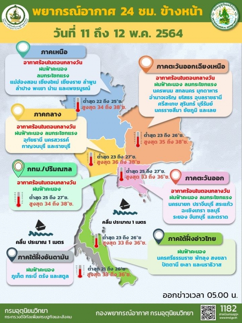 วันที่ 11 พฤษภาคม กรมอุตุนิยมวิทยา พยากรณ์อากาศ 24 ชั่วโมงข้างหน้า บริเวณประเทศไทยตอนบนมีอากาศร้อนในตอนกลางวัน กับมีฝนฟ้าคะนอง และลมกระโชกแรงบางพื้นที่ ทั้งนี้เนื่องจากลมตะวันออกเฉียงใต้พัดนำความชื้นจากอ่าวไทยและทะเลจีนใต้เข้ามาปกคลุมภาคเหนือตอนล่าง ภาคตะวันออกเฉียงเหนือ ภาคกลาง และภาคตะวันออก รวมทั้งกรุงเทพมหานครและปริมณฑล สำหรับลมตะวันออกพัดปกคลุมอ่าวไทย ภาคใต้ และทะเลอันดามัน ทำให้ภาคใต้มีฝนน้อยในระยะนี้