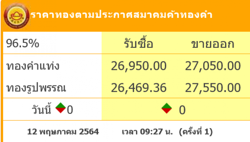 วันที่ 12 พฤษภาคม 2564 สมาคมค้าทองคำรายงาน ราคาทองไทย ครั้งที่ 1 เมื่อเวลา 09:29 น. โดยราคาทองล่าสุดราคานั้น ยังคงที่ ส่งผลทำให้ราคาวันนี้ทองคำแท่ ง รับซื้อบาทละ 26,950 ขายออกบาทละ 27,050 บาท ส่วนทองรูปพรรณ รับซื้อบาทละ 26,469.36 ขายออกบาทละ 27,550 บาท