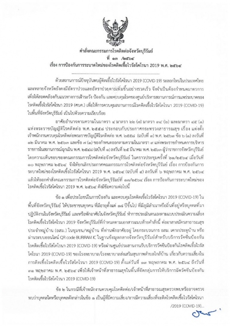 ข้อ 1.เพื่อประโยชน์ในการป้องกันและควบคุมโรคติดเชื้อไว้รัสโคโรนา 2019 ในพื้นที่จังหวัดบุรีรัมย์ ให้ประชาชนทุกคน ที่มีอายุตั้งแต่ 18 ปีขึ้นไป ที่มีภูมิลำเนาหรือถิ่นที่อยู่หรือบุคคลที่มาปฏิบัติงานในจังหวัดบุรีรัมย์ และหรือพักอาศัยในจังหวัดบุรีรัมย์ ทำการประเมินตนเองตามแบบประเมินความเสี่ยงโรคติดเชื้อไวรัสโคโรนา 2019 จังหวัดบุรีรัมย์ ที่กำหนดตามเอกสารแนบท้ายาคำสั่งนี้ ต่ออาสาสมัครสาธารณสุขประจำหมู่บ้าน (อสม.) ในชุมชน/หมู่บ้าน ที่ท่านพักอาศัยอยู่ โดยกระบวนการ อสม.เคาะประตูบ้าน หรือผ่านระบบออนไลน์ ในฐานข้อมูลกลางจังหวัดบุรีรัมย์ สำหรับบริการวัคซีนป้องกันโรคติดเชื้อไวรัสโคโรนา 2019 หรือผ่านศูนย์ประสานงานรับบริการวัคซีนป้องกันโรคติดเชื้อไวรัสโคโรนา 2019 ของโรงพยาบาล/โรงพยาบาลส่งเสริมสุขภาพตำบลใกล้บ้าน เกี่ยวกับความเสี่ยงการติดเชื้อ ตั้งแต่วันที่ 13 พ.ค.2564 ถึงวันที่ 31 พ.ค. 2564 เพื่อให้เจ้าหน้าที่สาธารณสุขในพื้นที่จัดกลุ่มการให้บริการฉีดวัคซีนป้องกันโรคติดเชื้อ