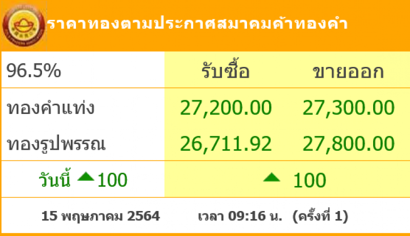 วันที่ 15 พฤษภาคม 2564 สมาคมค้าทองคำรายงาน ราคาทองไทย ครั้งที่ 1 เมื่อเวลา 09:16 น. โดยราคาทองล่าสุดราคานั้น ได้มีการปรับขึ้นมาอีก 100 บาท ส่งผลทำให้ราคาวันนี้ทองคำแท่ ง รับซื้อบาทละ 27,200 ขายออกบาทละ 27,300 บาท ส่วนทองรูปพรรณ รับซื้อบาทละ 26,711.92 ขายออกบาทละ 27,800 บาท