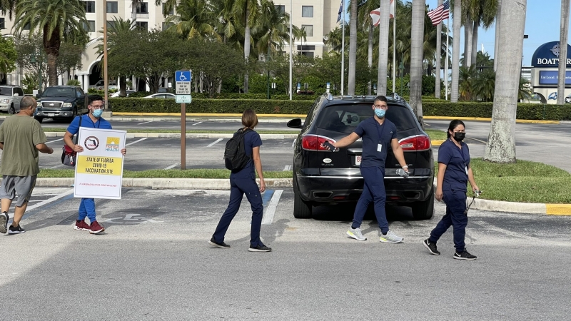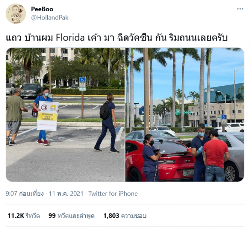 เป็นอีกหนึ่งเรื่องราว ที่ถูกพูดถึงในโลกออนไลน์ เมื่อผู้ใช้ทวิตเตอร์รายหนึ่ง ที่ใช้ชื่อว่า PeeBoo ได้โพสต์ภาพพร้อมกับข้อความ ระบุว่า ‘แถวบ้านผมที่ฟลอริดา เขามาฉีดวัคซีนกันริมถนนเลยครับ พร้อมกับโพสต์ภาพเจ้าหน้าที่ที่ออกมาชูป้ายเชิญชวนคนให้มาฉีดวัคซีน แบบเข้าถึงประชาชนแบบฉีดกันริมถนนเลย นอกจากนั้นผู้ที่สนใจสามารถรับการฉีดวัคซีนได้เลยและยังสามารถเลือกยี่ห้อได้ด้วยคือไฟเซอร์และโมเดอร์นา