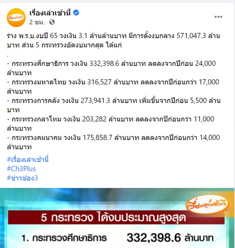 ล่าสุด ทางด้านเพจเฟสบุ๊ก เรื่องเล่าเช้านี้ ได้โพสต์รายละเอียด ร่าง พ.ร.บ.งบปี 65 วงเงิน 3.1 ล้านล้านบาท โดยระบุว่า