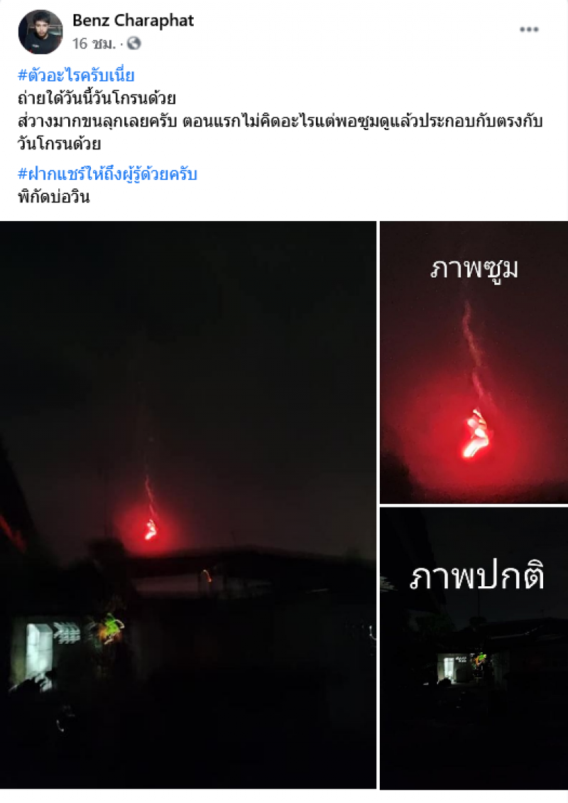 เป็นอีกหนึ่งเรื่องราว ที่ได้รับความสนใจในโลกออนไลน์ หลังจากผู้ใช้เฟซบุ๊กรายหนึ่ง ที่ได้มีการโพสต์ภาพดวงไฟปริศนาสีแดง ลอยอยู่สูงเหนือหลังคาบ้านในช่วงกลางคืน โดยระบุว่า #ตัวอะไรครับเนี่ย ถ่ายใด้วันนี้วันโกรนด้วย ส่วางมากข นลุกเลยครับ ตอนแรกไม่คิดอะไรแต่พอซูมดูแล้วประกอบกับตรงกับวันโกรนด้วย #ฝากแชร์ให้ถึงผู้รู้ด้วยครับ พิกัดบ่อวิน โดยหลังจากที่ได้มีการโพสต์ภาพออกไป ก็มีคนเข้ามาแสดงความคิดเห็นกันเป็นจำนวนมาก ซึ่งต่างก็สงสัยว่า ดวงไฟที่ลอยอยู่นั้นคืออะไรกันแน่