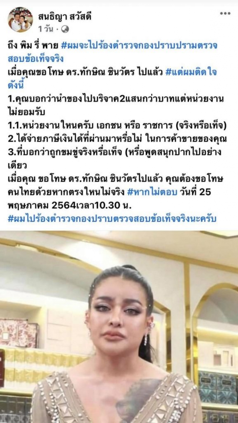วันที่ 21 พ.ค. นายสนธิญา สวัสดี อดีตสมาชิกพรรคพลังประชารัฐ ได้โพสต์ถึง พิมรี่พาย ยูทูบเบอร์และบิวตี้บล็อกเกอร์ชื่อดังปล่อย ตอบคำถาม 3 ข้อ ถ้าไม่ตอบ จะเข้าร้องกองปราบฯให้ตรวจสอบทุกข้อ
