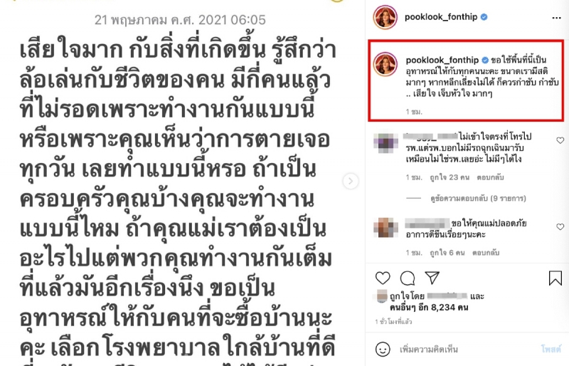 โดย สาวปุ๊กลุก ได้โพสต์ระบุข้อความว่า เมื่อคืนตอนเที่ยงคืน คุณแม่ล้ม หัวฟาดพื้น สลบ ไม่รู้ตัว เลยรีบพามาส่งโรงพยาบาล คุณแม่หยุดหายใจไป 10 นาที แต่คุณหมอช่วยปั๊ม และฉีดยา คุณแม่กลับมาหายใจได้ แต่ยังอยู่ในอาการโคม่า .. แต่เรื่องที่ทำให้เจ็บช้ำหัวใจที่สุด คือ ตอนที่คุณแม่ล้ม สภาพที่เห็นคือเลือดกองเต็มพื้น ขณะที่กำลังเคลื่อนย้ายแม่ก็เห็นว่าปากคุณแม่เริ่มม่วงแล้ว ตัดสินใจอุ้มคุณแม่ขึ้นรถ โดยมีพี่สาวขับรถ และเรานั่งประคองคุณแม่ ระหว่างทางได้โทรหาโรงพยาบาลๆหนึ่ง (ขอไม่เอ่ยชื่อ) ที่ใกล้บ้าน (นนทบุรี) และราคาค่อนข้างสูง ว่ารบกวนส่งรถพยาบาลมารับได้ไหม หากสวนกันจะได้รับคุณแม่ขึ้นรถที่มีอุปกรณ์ที่สามารถช่วยชีวิตคุณแม่ได้ทันเวลา เพราะดูอาการแม่แย่มากๆเลือดยังไหลเต็มมือ โรงพยาบาลที่รับโทรศัพท์แจ้งว่า ไม่มีรถ เลยบอกว่างั้นรบกวนเตรียมเตียงและทีมงานให้พร้อม เพราะตอนนี้คุณแม่หมดสติ ปากม่วง และเลือดออกเยอะมาก ไม่รู้ว่าหยุดหายใจหรือยัง ซึ่งจะใช้เวลาเดินทางไม่เกิน 10-15 นาที ปรากฎว่ามาถึง สิ่งที่เห็นคือไม่มีพนักงานคนไหนอยู่ตรงส่วนฉุกเฉินเลยสักคน จึงกดแตรเรียก ประมาณเกือบๆ 30 วินาที ซึ่งนานมากๆ