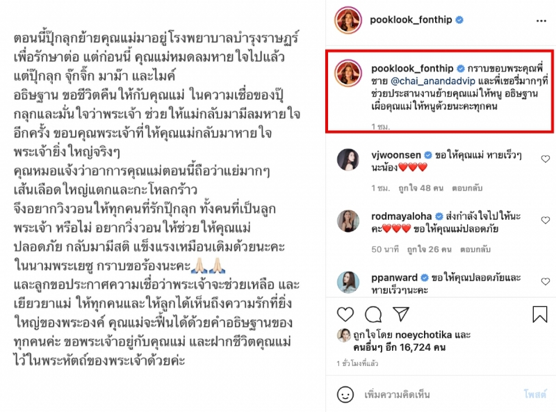 เเละล่าสุด สาวปุ๊กลุก นั้นก็ได้โพสต์อัพเดทอาการคุณแม่ ว่ามีอาการแย่กว่าเดิม สมองบวม หลังหยุดหายใจนานเกินไป โดยเธอนั้นได้โพสต์ระบุข้อความว่า คุณแม่เหมือนจะอาการแย่กว่าเดิมเนื่องจากสมองบวมมากสาเหตุคือช่วงที่หยุดหายใจนานเกินไป คุณหมอพยายามพยายามลดบวมอยู่ตั้งแต่เมื่อวาน วันนี้เหมือนจะไม่ดีขึ้น แต่เชื่อในการอัศจรรย์ของพระเจ้านะคะ เชื่อแม้ท่ามกลางความไม่น่าเชื่อ เชื่ออย่างหมดใจว่าพระเจ้าจะให้แม่ฟื้น ฝากทุกคนยังอธิษฐานเผื่อคุณแม่ให้หน่อยนะคะ กราบขอร้องค่ะในนามพระเยซู เอเมน และพี่น้องคริสเตียนช่วยหนูด้วยนะคะ ใครอดอาหารเผื่อได้ปวดและอธิฐานเผื่อแม่หนูทีนะคะ ขอพระเจ้าเมตตาคุณแม่หนูด้วย