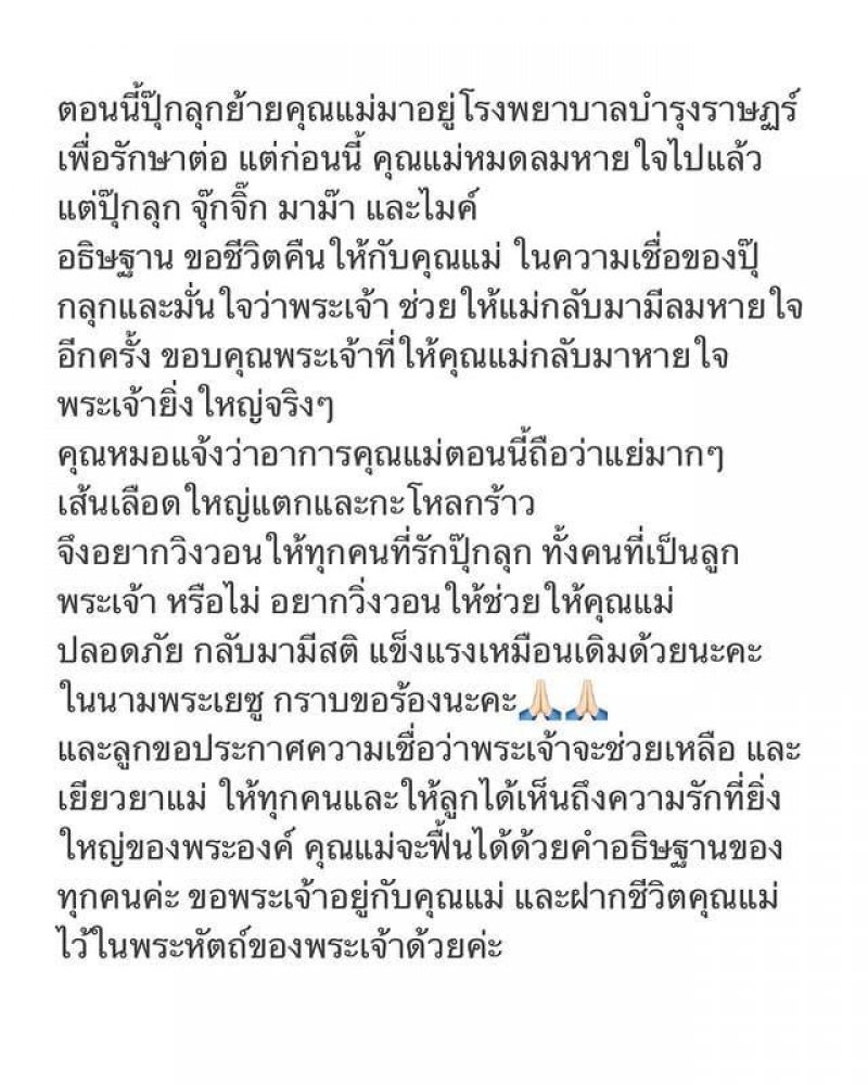 ปุ๊กลุกบอกอีกว่า ตนเชื่อว่าคุณแม่จะฟื้นด้วยคำอธิษฐานของทุกคน และขอฝากชีวิตคุณแม่ไว้ในพระหัตถ์ของพระเจ้า ตนเชื่ออย่างหมดใจว่าพระเจ้าจะทำให้คุณแม่ฟื้น และฝากทุกคนที่เป็นคริสเตียนช่วยกันภาวนาด้วย