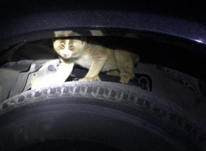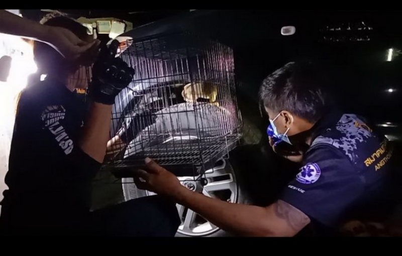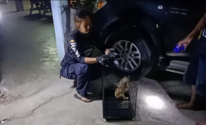 ได้แอบซุกซ่อนตัวอยู่ที่บริเวณไต้ซุ้มล้อรถยนต์ โตโยต้า สีดำ หมายเลขทะเบียน บน 9730 ลพบุรี โดยกำลังนั่งกินไข่ไก่อย่างมีความสุข ทางเจ้าหน้าที่กู้ภัยได้ใช้กรงไปวางไว้บริเวณด้านข้างล้อรถยนต์แล้วทำการต้อนให้เข้าไปอยู่ในกรงที่เตรียมมาอย่างง่ายดายใช้เวลาประประมาณ 10 นาทีจึงทำการจับได้อย่างปลอดภัย