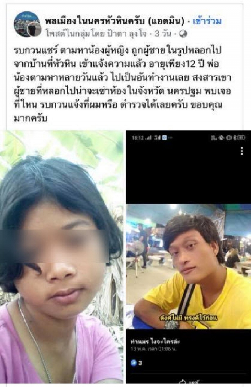 นอกจากนี้ทางเพจยังได้แจกวาร์ปเฟซบุ๊กของชายคนดังกล่าวอีกด้วย ซึ่งเมื่อเข้าไปตรวจสอบพบว่าชายและหญิงสาวคนนี้คือคนที่ครอบครัวฝ่ายหญิงได้ลงประกาศตามหาเอาไว้เมื่อประมาณ 3 วันก่อนหน้าที่ทางเพจจะนำโพสต์ข้างต้นมาแชร์ โดยในเนื้อหาระบุว่า "รบกวนแชร์ตามหาน้องผู้หญิงถูกผู้ชายในรูปหลอกไปจากบ้านที่หัวหิน เขาแจ้งความแล้วน้องอายุ 12 ปี พ่อน้องตามหาหลายวันแล้วไม่เป็นอันทำงานเลยสงสารเขาผู้ชายที่หลอกไปน่าจะเช่าห้องในจังหวัดนครปฐมพบเจอที่ไหนรบกวนแจ้งที่ผมหรือตำรวจได้เลยครับขอบคุณมากครับ"
