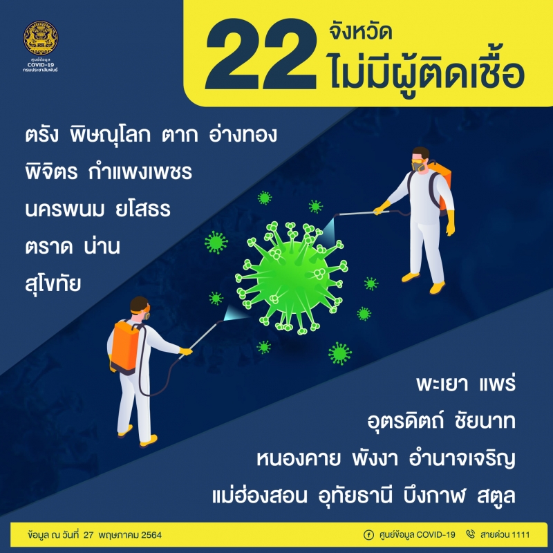 ซึ่งเมื่อเวลาประมาณ 16.00 น. ทางด้านเพจศูนย์ข้อมูล COVID-19 ได้ออกมาโพสต์ข้อความรายงาน 22 จังหวัด ไม่มีผู้ติดเชื้อ ได้แก่ จังหวัดตรัง , พิษณุโลก , ตาก , อ่างทอง , พิจิตร , กำแพงเพชร , นครพนม , ยโสธร , ตราด , น่าน , สุโขทัย , พะเยา , แพร่ อุตรดิตถ์ , ชัยนาท , หนองคาย พังงา , อำนาจเจริญ , แม่ฮ่องสอน , อุทัยธานี , บึงกาฬ และสตูล ซึ่งข้อมูลนี้เป็นข้อมูลของวันที่ 27 พ.ค.2564