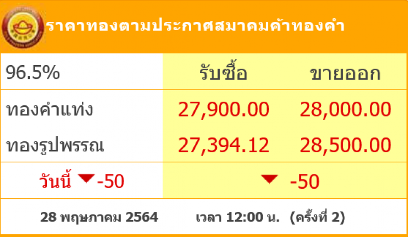 วันที่ 28 พฤษภาคม 2564 สมาคมค้าทองคำรายงาน ราคาทองไทย ครั้งที่ 2 เมื่อเวลา 12:00 น. โดยราคาทองล่าสุดราคานั้น ได้มีการปรับลดลงมา 50 บาท ส่งผลทำให้ราคาวันนี้ทองคำแท่ ง รับซื้อบาทละ 27,900 ขายออกบาทละ 28,000 บาท ส่วนทองรูปพรรณ รับซื้อบาทละ 27,394.12 ขายออกบาทละ 28,500 บาท