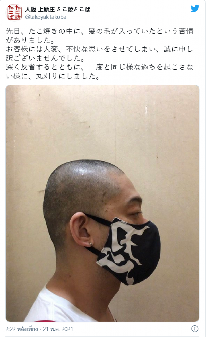 โดยภายในทวีตของร้านทาโกะบะคุณเจ้าของร้านได้ระบุไว้ว่า เมื่อวันก่อนผมได้รับการร้องเรียนว่ามีลูกค้าพบเส้นผมในทาโกะยากิของพวกเขา ผมขอโทษจริงๆ ที่ทำให้ลูกค้าไม่สบายใจเช่นนี้ และเพื่อแสดงความเสียใจอย่างสุดซึ้งผมจึงได้โกนผม และสัญญาว่าจะไม่ทำผิดแบบเดิมอีก