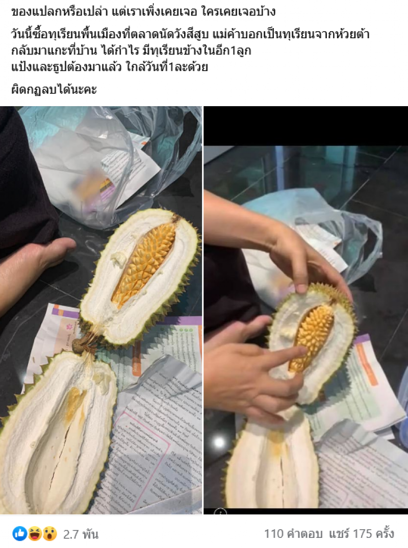 ผู้ใช้เฟซบุ๊กรายหนึ่งได้โพสต์และข้อความเกี่ยวกับทุเรียนสุดแปลกในกลุ่ม ของกินอุตรดิตถ์ โดยระบุว่า ของแปลกหรือเปล่า แต่เราเพิ่งเคยเจอ ใครเคยเจอบ้าง วันนี้ซื้อทุเรียนพื้นเมืองที่ตลาดนัดวังสีสูบ แม่ค้าบอกเป็นทุเรียนจากห้วยต้า กลับมาแกะที่บ้าน ได้กำไร มีทุเรียนข้างในอีก 1 ลูก แป้งและธูปต้องมาแล้ว ใกล้วันที่ 1 ละด้วย