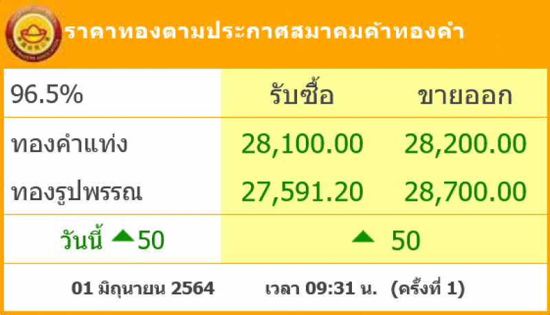 วันที่ 1 มิถุนายน 2564 สมาคมค้าทองคำรายงาน ราคาทองไทย ครั้งที่ 1 เมื่อเวลา 09:31 น. โดยราคาทองล่าสุดราคานั้น ได้มีการปรับขึ้นมาอีก 50 บาท ส่งผลทำให้ราคาวันนี้ทองคำแท่ ง รับซื้อบาทละ 28,100 ขายออกบาทละ 28,200 บาท ส่วนทองรูปพรรณ รับซื้อบาทละ 27,591.20 ขายออกบาทละ 28,700บาท