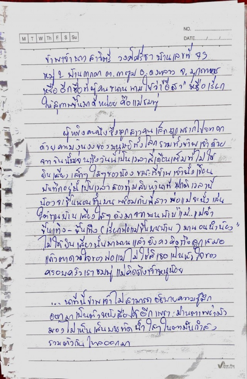- บันทึกหน้าที่ 1 ข้าพเจ้า นางสาวิตรี วงศ์ศรีชา หรือ แม่น้องชมพู่ บ้านเลขที่ 73 หมู่ 2 บ้านกกกอก ต.กกตูม อ.ดงหลวง จ.มุกดาหาร ผู้หญิงคนหนึ่งซึ่งลูกสาวคนเล็กถูกพรากไปจากอก ด้วยความงุนงงของมนุษย์ทั้งโลกรวมถึงข้าพเจ้าด้วย จากวันนั้นจนถึงวันนี้ เป็นเวลา 4 เดือนเต็ม ที่ไม่ได้ยินเสียงเล็กๆ ใสๆ ของลูกสาวตัวน้อย ขณะที่ข้าพเจ้านั่งเขียนบันทึกอยู่นี้ เป็นเวลา 2 ทุ่ม 15 นาที ปกติเวลานี้น้องจะขึ้นนอนชั้นบนพร้อมกับพี่สาว