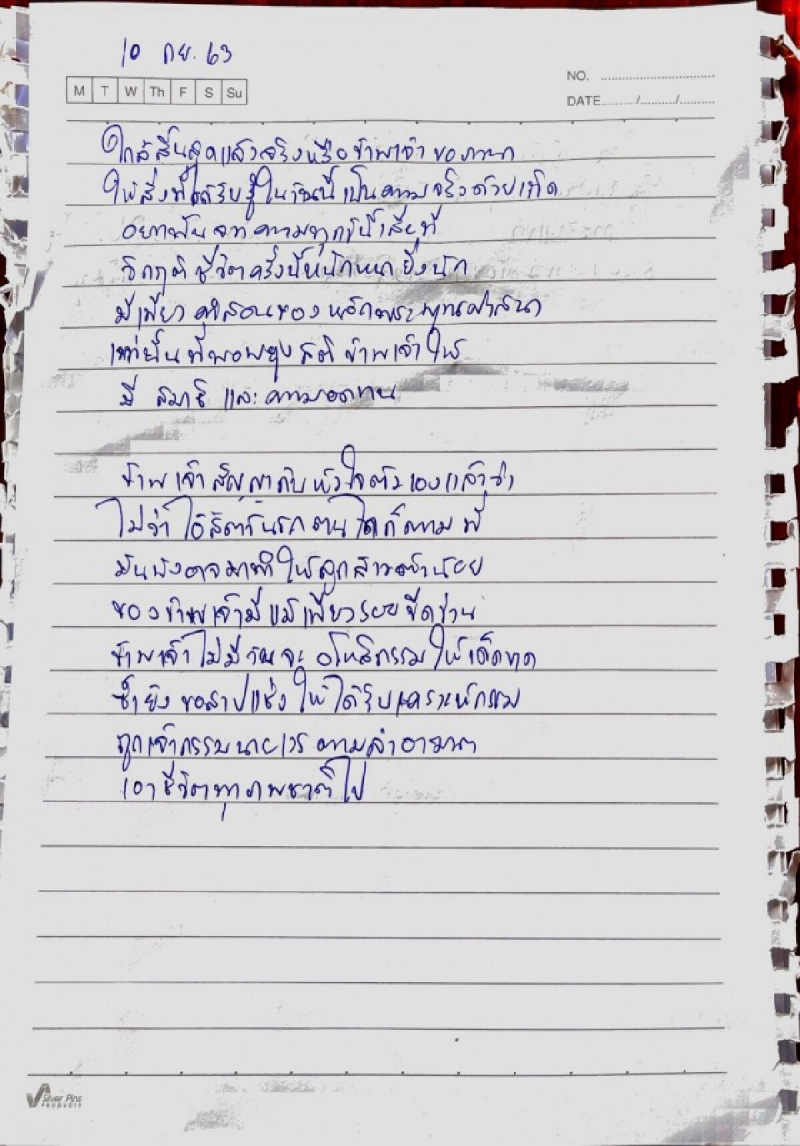 - บันทึกหน้าที่ 4 ลงวันที่ 10 กันยายน 2563 ใกล้สิ้นสุดแล้วจริงหรือ ข้าพเจ้าขอภาวนาให้สิ่งที่ได้รับรู้ในวันนี้เป็นความจริงด้วยเถิด อยากพ้นจากความทุกข์นี้เสียที วิกฤตชีวิตครั้งนี้หนักหนายิ่งหนัก มีเพียงคำสอนของหลักพระพุทธศาสนาเท่านั้น ที่พอพยุงสติข้าพเจ้าให้มีสมาธิ และความอดทน