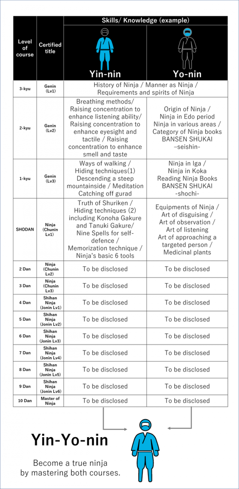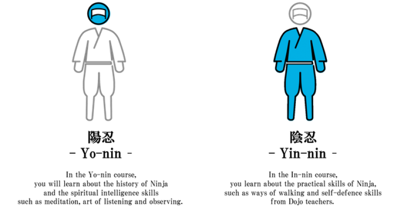 สำหรับหลักสูตรของโรงเรียนฝึกนินจาออนไลน์ที่จะนำมาฝึกหัดนี้ มีพื้นฐานมาจากงานเขียนทางประวัติศาสตร์ โดยปรมาจารย์นินจาในยุคเอโดะ ซึ่งแบ่งออกเป็นสองหลักสูตรการศึกษาคู่ขนาน หรือที่เรียกว่า วิชา โย-นิน หมายถึงปัญญา และ ยิน-นิน หมายถึง ทักษะการปฏิบัติ โดยแต่ละหลักสูตรจะแบ่งออกเป็นระดับ คิว และ ดัน คล้ายกับระบบการจัดอันดับของกีฬาศิลปะการป้องกันตัวจำนวนมาก