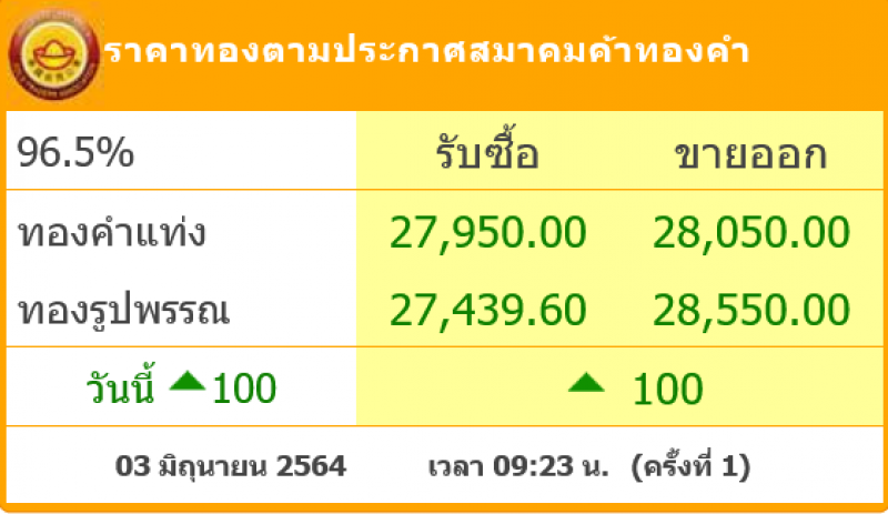 วันที่ 3 มิถุนายน 2564 สมาคมค้าทองคำรายงาน ราคาทองไทย ครั้งที่ 1 เมื่อเวลา 09:23 น. โดยราคาทองล่าสุดราคานั้น ได้มีการปรับขึ้นมา 100 บาท ส่งผลทำให้ราคาวันนี้ทองคำแท่ ง รับซื้อบาทละ 27,950 ขายออกบาทละ 28,050 บาท ส่วนทองรูปพรรณ รับซื้อบาทละ 27,439.60 ขายออกบาทละ 28,550บาท