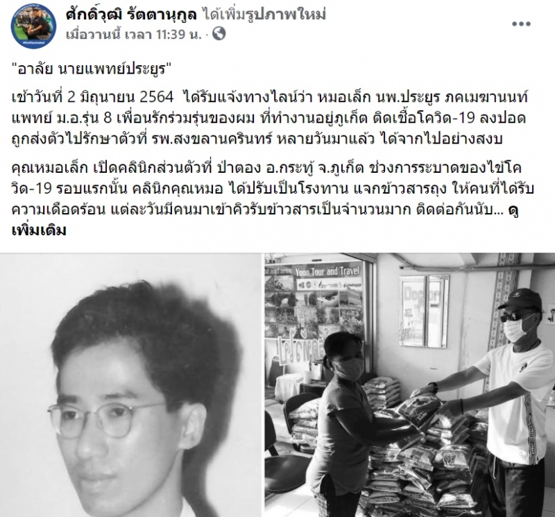 และนอกจากนี้ยังเล่าประวัติของคุณหมอว่า :คุณหมอเล็ก เปิดคลินิกส่วนตัวที่ ป่าตอง อ.กระทู้ จ.ภูเก็ต ช่วงการระบาดของไข้โควิ-19 รอบแรกนั้น คลินิกคุณหมอ ได้ปรับเป็นโรงทาน แจกข้าวสารถุง ให้คนที่ได้รับความเดือดร้อน แต่ละวันมีคนมาเข้าคิวรับข้าวสารเป็นจำนวนมาก ติดต่อกันนับเดือน