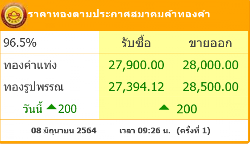 วันที่ 8 มิถุนายน 2564 สมาคมค้าทองคำรายงาน ราคาทองไทย ครั้งที่ 1 เมื่อเวลา 09:26 น. โดยราคาทองล่าสุดราคานั้น ได้มีการปรับขึ้นมา 200 บาท ส่งผลทำให้ราคาวันนี้ทองคำแท่ ง รับซื้อบาทละ 27,900 ขายออกบาทละ 28,000 บาท ส่วนทองรูปพรรณ รับซื้อบาทละ 27,394.12 ขายออกบาทละ 28,500บาท