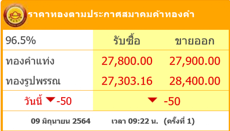 วันที่ 9 มิถุนายน 2564 สมาคมค้าทองคำรายงาน ราคาทองไทย ครั้งที่ 1 เมื่อเวลา 09:26 น. โดยราคาทองล่าสุดราคานั้น ได้มีการปรับลงมา 50 บาท ส่งผลทำให้ราคาวันนี้ทองคำแท่ ง รับซื้อบาทละ 27,800 ขายออกบาทละ 27,900 บาท ส่วนทองรูปพรรณ รับซื้อบาทละ 27,303.16 ขายออกบาทละ 28,400บาท