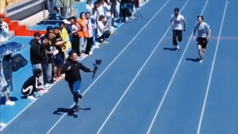 เหตุการณ์สุดฮาครั้งนี้ เกิดขึ้นที่มหาวิทยาลัยต้าถง มณฑลชานซี ประเทศจีน กับสุดยอดตากล้องนักศึกษาที่กำลังทำหน้าที่บันทึกภาพการแข่งขันกรีฑาระยะ 100 เมตร เขาไม่มีอะไรเลยนอกจากตัวและกล้องในมือ ก่อนเริ่มแข่งกรีฑาจะเห็นได้ว่าตากล้องยืนนำหน้าเหล่านักวิ่งด้วยระยะหนึ่ง ต่อพอเริ่มแข่งปุ๊บ ตากล้องใส่เกียร์สับอย่างไวขณะที่พยายามรักษาระยะกับนักวิ่งพร้อมกับกล้องที่หนักประมาณ 4 กิโลกรัม