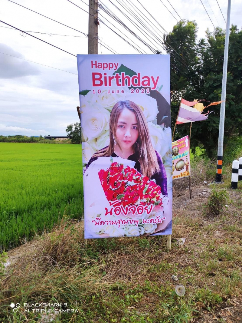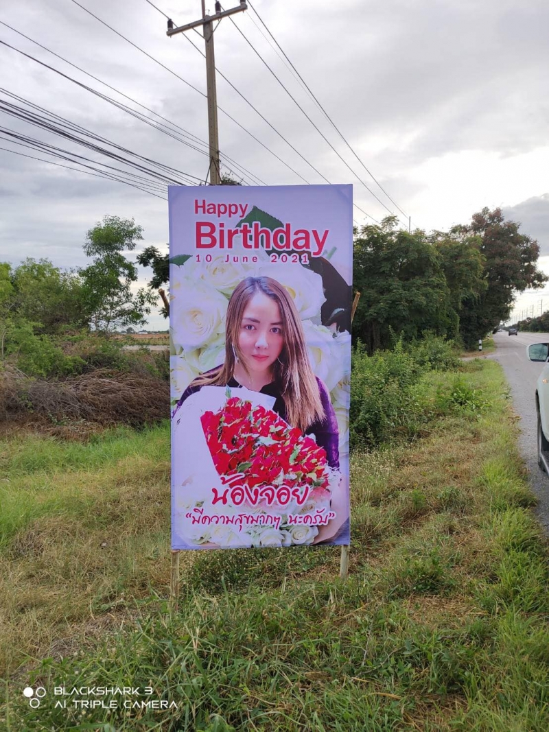 ผู้ใช้เฟซบุ๊กชื่อ Jeab Suphanblood ได้โพสต์ภาพ ป้ายขนาด 1.20 x 2.40 เมตร ริมถนน วัดไผ่โรงวัว เข้าตัว อำเภอสองพี่น้อง จังหวัดสุพรรณบุรี พร้อมระบุข้อความว่า ลูกค้าร้านเรา มีความน่ารักมุ้งมิ้ง ป้ายเซอร์ไพรส์วันเกิด จัดไป 10 แผ่น ตีกรอบไม้พร้อมติดตั้ง