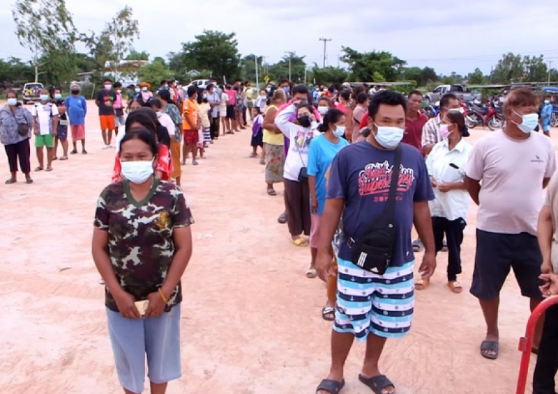 ซึ่งมีชาวบ้านมาต่อแถวรอรับของเป็นตำนวนมาก มีทั้งเด็กเล็กไปถึงผู้เฒ่าผู้แก่ ซึ่งเป็นการแจกครั้งละ 10 ชุด โดยใช้เวลาประมาณ 30 นาที ซึ่งท้ายที่สุดของแจกไม่พอต่อชาวบ้านที่มารอรับของแจก