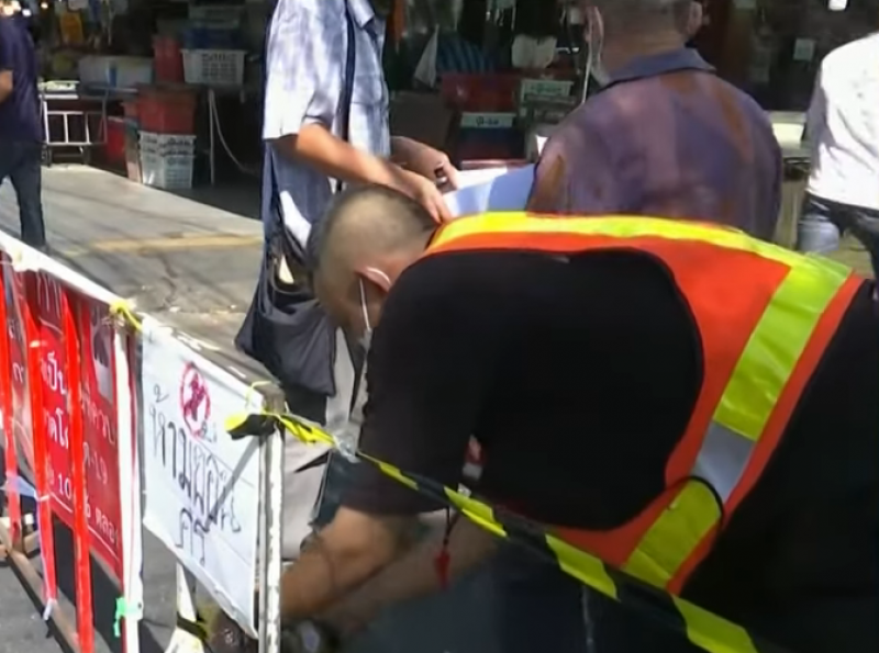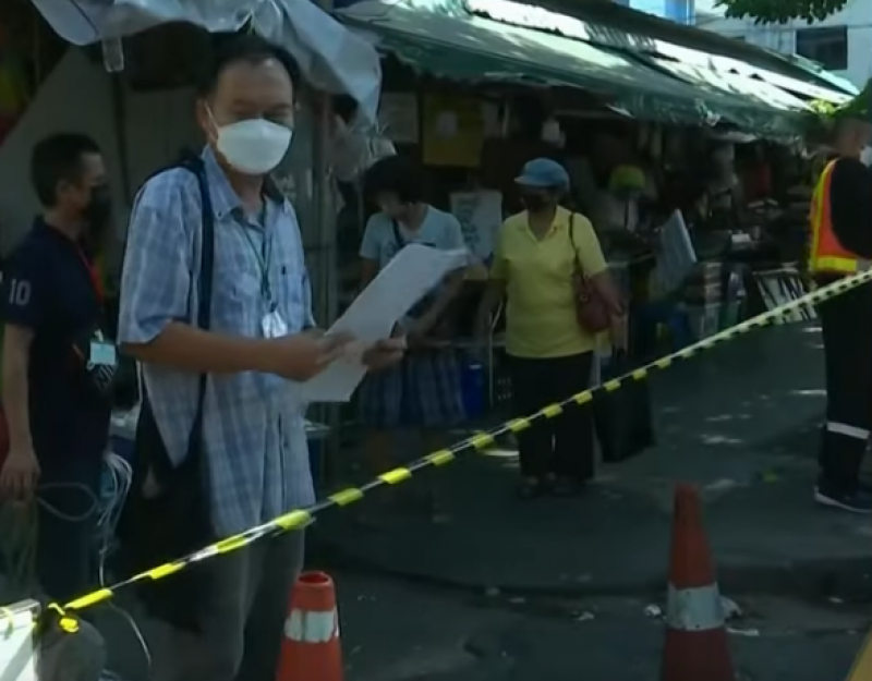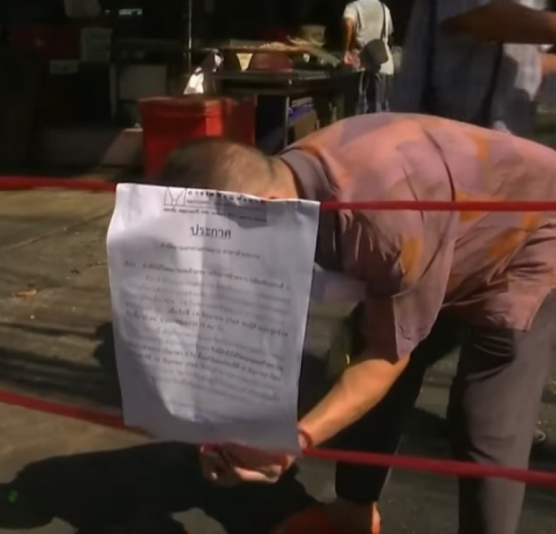 นายสว่าง สาขา เลขานุการตลาดสดห้วยขวาง พร้อมด้วยกรรมการตลาด นำป้ายประกาศจากสำนักงานเคหะนครหลวง สาขาห้วยขวาง เรื่องคำสั่งให้ปิดตลาดสดห้วยขวางเป็นการชั่วคราว (เพิ่มเติมฉบับที่ 3) ตั้งแต่วันที่ 17 ถึงวันที่ 19 มิถุนายนนี้