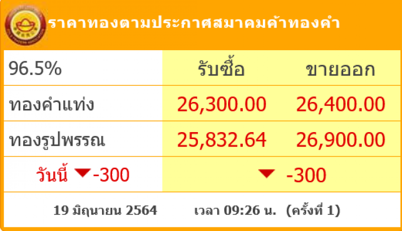 ราคาทองวันนี้ ราคาทองคำ ประจำวันเสาร์ที่ 19 มิถุนายน 2564 เวลา 09:26 น.