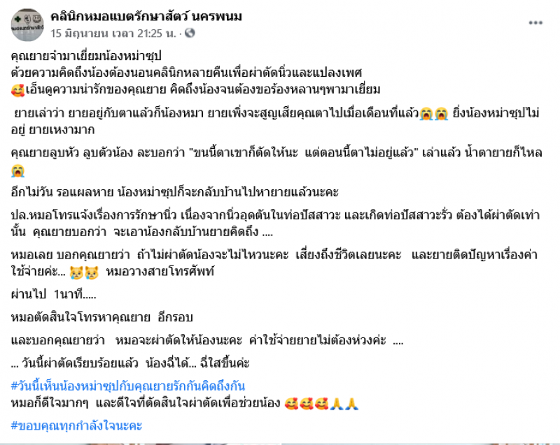 ปล.หมอโทรแจ้งเรื่องการรักษานิ่ว เนื่องจากนิ่วอุดตันในท่อปัสสาวะ และเกิดท่อปัสสาวะรั่ว ต้องได้ผ่าตัดเท่านั้น คุณยายบอกว่า จะเอาน้องกลับบ้านยายคิดถึง หมอเลย บอกคุณยายว่า ถ้าไม่ผ่าตัดน้องจะไม่ไหวนะคะ เสี่ยงถึงชีวิตเลยนะคะ และยายติดปัญหาเรื่องค่าใช้จ่ายค่ะ หมอวางสายโทรศัพท์ ผ่านไป 1นาที หมอตัดสินใจโทรหาคุณยาย อีกรอบ และบอกคุณยายว่า หมอจะผ่าตัดให้น้องนะคะ ค่าใช้จ่ายยายไม่ต้องห่วงค่ะ