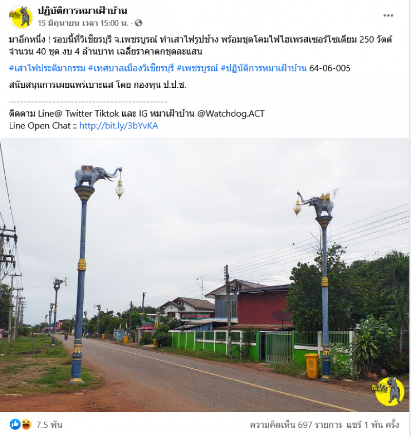 จากที่ก่อนหน้านี้ เพจปฏิบัติการหมาเฝ้าบ้าน โพสต์ภาพพร้อมข้อความว่า มาอีกหนึ่ง รอบนี้ที่วิเชียรบุรี จ.เพชรบูรณ์ ทำเสาไฟรูปช้าง พร้อมชุดโคมไฟ ไฮเพรสเซอร์โซเดียม 250 วัตต์ จำนวน 40 ชุด งบ 4 ล้านบาท เฉลี่ยราคาตกชุดละแสน