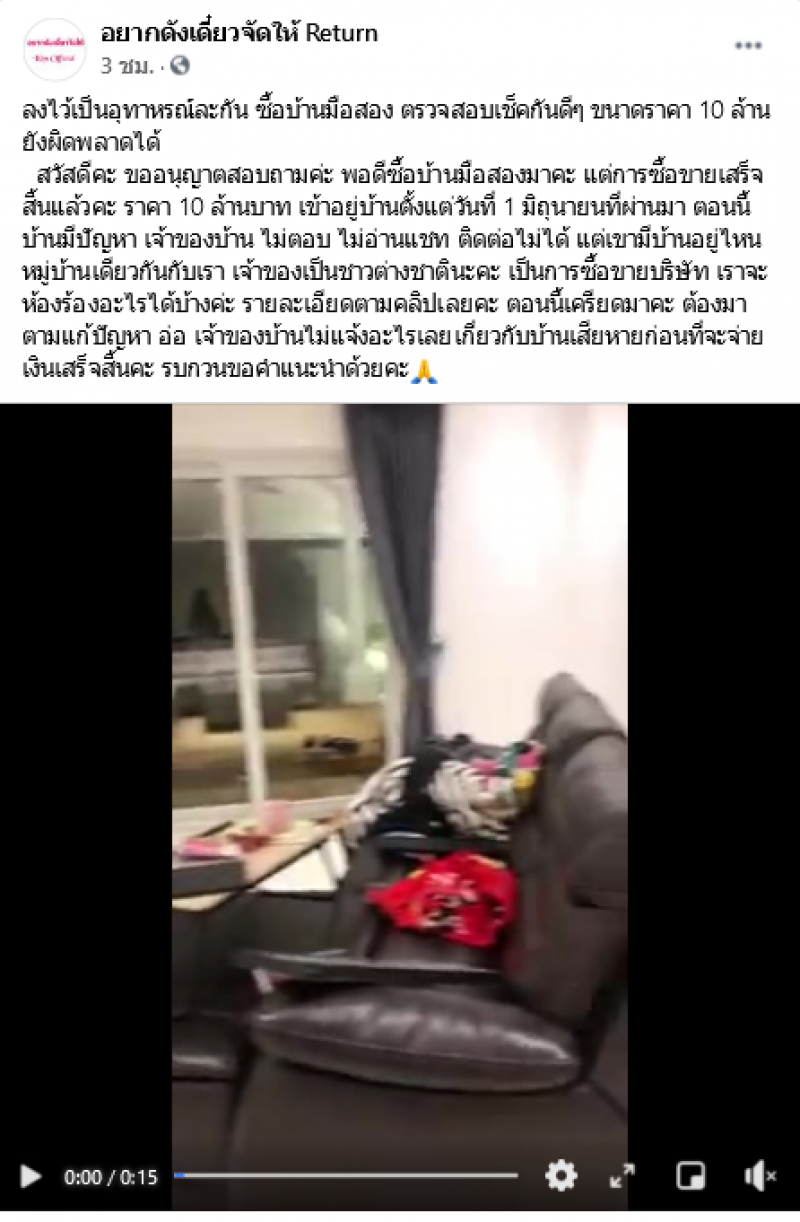 สวัสดีคะ ขออนุญาตสอบถามค่ะ พอดีซื้อบ้านมือสองมาคะ แต่การซื้อขายเสร็จสิ้นแล้วคะ ราคา 10 ล้านบาท เข้าอยู่บ้านตั้งแต่วันที่ 1 มิถุนายนที่ผ่านมา ตอนนี้บ้านมีปัญหา เจ้าของบ้าน ไม่ตอบ ไม่อ่านแชท ติดต่อไม่ได้ แต่เขามีบ้านอยู่ไหนหมู่บ้านเดียวกันกับเรา เจ้าของเป็นชาวต่างชาตินะคะ เป็นการซื้อขายบริษัท เราจะร้องอะไรได้บ้างค่ะ รายละเอียดตามคลิปเลยคะ ตอนนี้เครียดมาคะ ต้องมาตามแก้ปัญหา อ่อ เจ้าของบ้านไม่แจ้งอะไรเลยเกี่ยวกับบ้านเสียหายก่อนที่จะจ่ายเงินเสร็จสิ้นคะ รบกวนขอคำแนะนำด้วยคะ