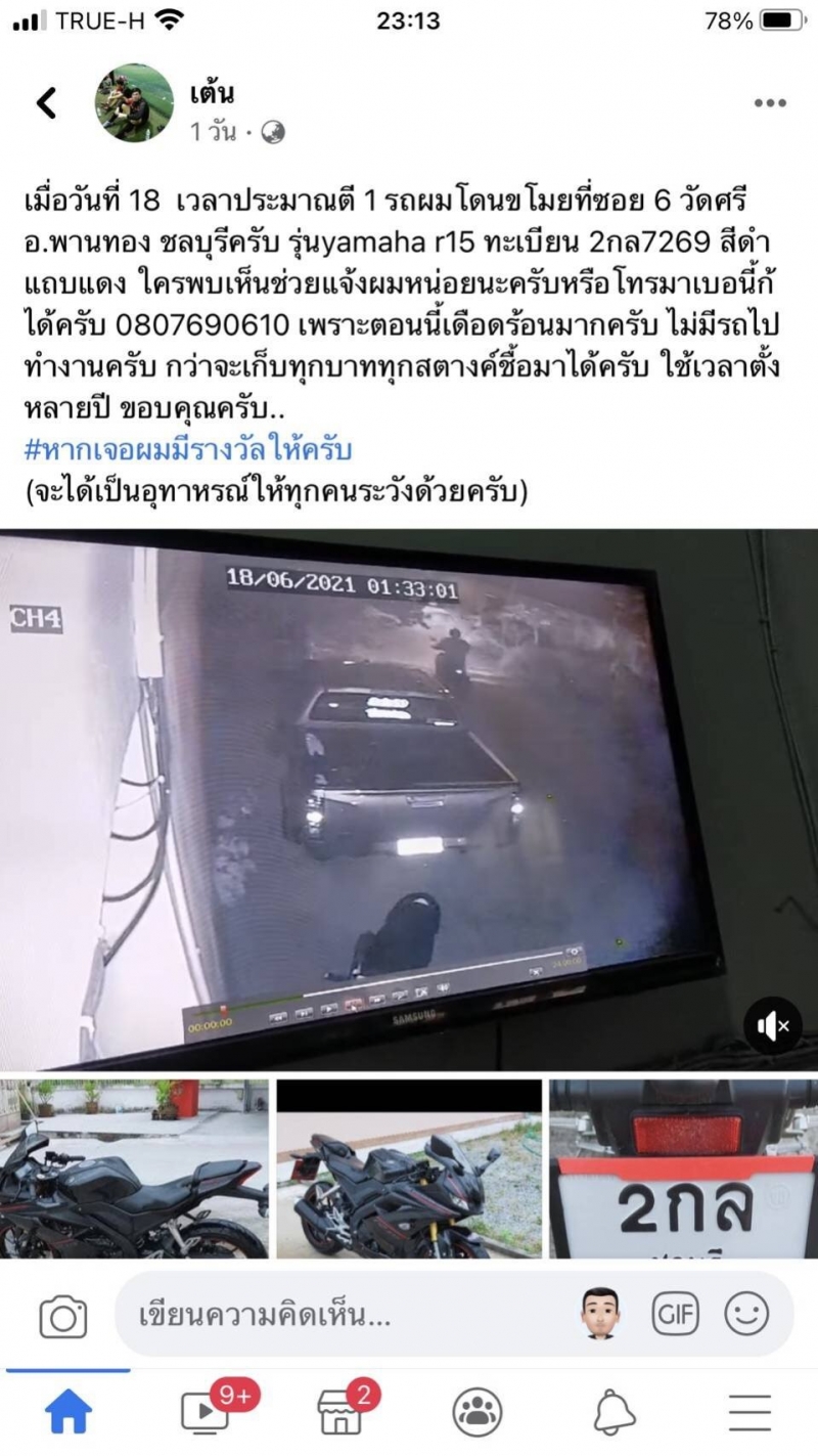 โดยระบุข้อความว่า เมื่อวันที่ 18 มิ.ย.64 เวลาประมาณตี 1 รถผมโดนขโมยที่ซอย 6 วัดศรี อ.พานทอง ชลบุรีครับ รุ่นยามาฮ่าr15 ทะเบียน 2กล7269 สีดำ แถบแดง ใครพบเห็นช่วยแจ้งผมหน่อยนะครับ หรือโทรมาเบอร์นี้ก็ได้ครับ 0807690610 เพราะตอนนี้เดือดร้อนมากครับ ไม่มีรถไปทำงานครับ กว่าจะเก็บทุกบาททุกสตางค์ชื้อมาได้ครับใช้เวลาตั้งหลายปีขอบคุณครับ #หากเจอผมมีรางวัลให้ครับ (จะได้เป็นอุทาหรณ์ให้ทุกคนระวังด้วยครับ)