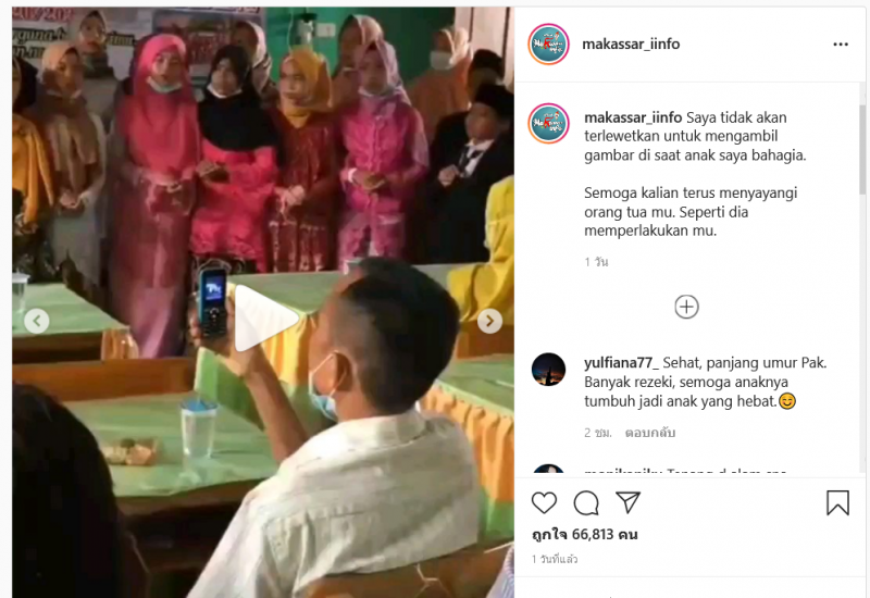 คลิปวิดีโอถูกเผยแพร่บนอินสตาแกรม บัญชี @makassar_iinfo ชาวโซเชียลต่างพากันซึ้งในการกระทำของคุณพ่อ พวกเขาคาดเดาไปต่าง ๆ นานาว่า บางทีคุณพ่ออาจยอมใช้โทรศัพท์รุ่นเก่า เพื่อเก็บเงินส่งลูกเรียน หรือเก็บเงินซื้อโทรศัพท์รุ่นใหม่ให้ลูกก็เป็นได้ และถึงแม้จะเป็นโทรศัพท์รุ่นเก่า ถ่ายวิดีโอไม่ค่อยชัด แต่อย่างน้อยคุณพ่อก็พยายามเต็มที่แล้ว ที่จะบันทึกช่วงเวลาอันมีค่าของลูก
