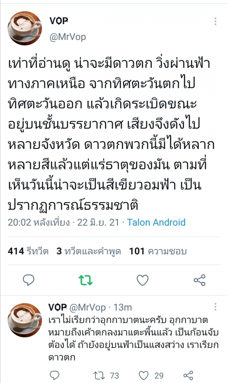 เมื่อช่วงเย็นวันนี้ (22 มิ.ย.64) เวลาปรมาณ 19.00 น. รายงานข่าวแจ้งว่า หลายพื้นที่ของจังหวัดเชียงใหม่ ได้เกิดเหตุการณ์ประหลาด จากการที่มีประชาชนหลายคนได้ยินเสียงตูมดังสนั่นอย่างพร้อมกันจากหลายอำเภอ โดยประชาชนหลายคนต่างตั้งขอสงสัยกับเหตุการณ์ที่เกิดขึ้นและยังหาคำตอบไม่ได้ แต่ต่างบอกเป็นเสียงเดียวกันว่าได้ยินเสียงดังสนัน แต่ไม่รู้ว่าเกิดขึ้นากจุดใด ทั้งนี้ในโซเชียลมีคนเผยว่าก่อนที่จะเกิดเสียงดังขึ้น ปรากฎเป็นแสงสีเขียวบนท้องฟ้า คล้ายตาวตก