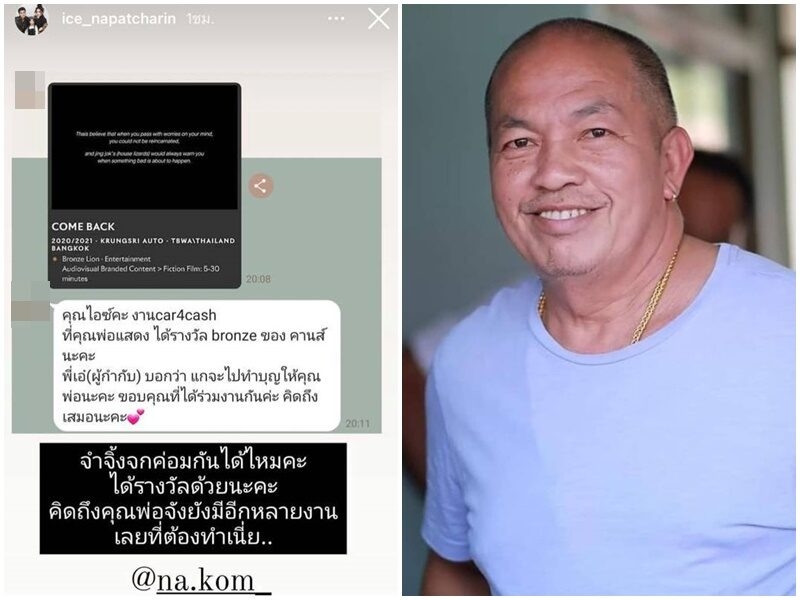ทำเอาแฟนๆ แห่ยินดีกันเป็นจำนวนมาก หลังไอซ์ ลูกสาวของน้าค่อม ชวนชื่น แชร์แชทสนทนาของทีมงานแจ้งข่าวว่า คุณไอซ์ค่ะ งาน Car4cash ที่คุณพ่อแสดง ได้รางวัล bronze ของคานส์นะคะ พี่เอ๋ (ผู้กำกับ) บอกว่า แกจะไปทำบุญให้คุณพ่อนะคะ ขอบคุณที่ได้ร่วมงานกันนะคะ คิดถึงเสมอนะคะ