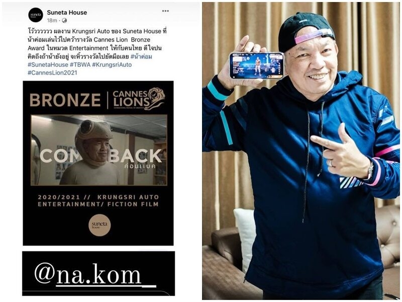 โว้วผลงาน Krungsri Auto ของ Suneta House ที่น้าค่อมเล่นไว้ไปคว้ารางวัล Cannes Lions Bronze Award ในหมวด Entertainment ให้กับคนไทย ดีใจปนคิดถึงถ้าน้ายังอยู่ จะหิ้วรางวัลไปยัดมือเลย