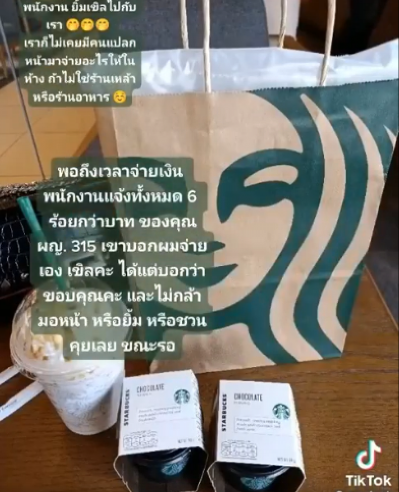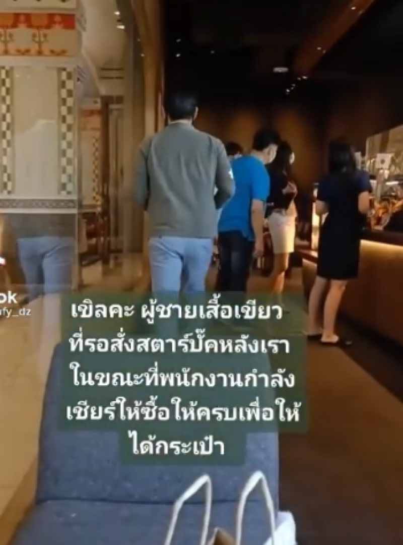 น้องผู้หญิงท่านนี้กำลังสั่งเมนูของสตาร์บัคส์ พนักงานบอกว่าถ้าสั่งครบยอดจะได้กระเป๋า เธอก็ลังเลเพราะไม่รู้จะสั่งเมนูไหนดีเพื่อให้ครบยอด สุภาพบุรุษที่รอคิวต่อจากเธอเลยเสนอว่า รวมบิลกับผมไหมครับ?