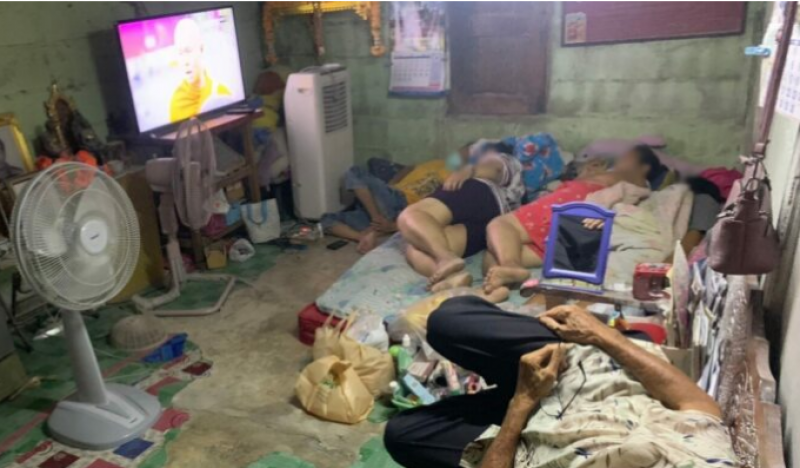 เมื่อไปถึงบ้านหลังดังกล่าวเป็นบ้านไม้สองชั้น และมีรถจักรยานยนต์จอดอยู่หลายคัน เจ้าหน้าที่ได้ทำการเรียกให้คนข้างในมาเปิดประตูรั้วบ้าน บางคนมีทีท่าว่าจะวิ่งหลบหนีแต่ออกจากบ้านไม่ได้จึงวิ่งกลับไป เข้าไปตรวจสอบพบกลุ่มคน 6 คน เป็นชาย 1 คน หญิง 5 คน มีชายวัย 82 ปี กำลังทำทีท่านอนหลับอยู่ และอีกจำนวนหนึ่งเปิดโทรทัศน์นอนดูอยู่ ทีท่าไม่สนใจอะไรเลย
