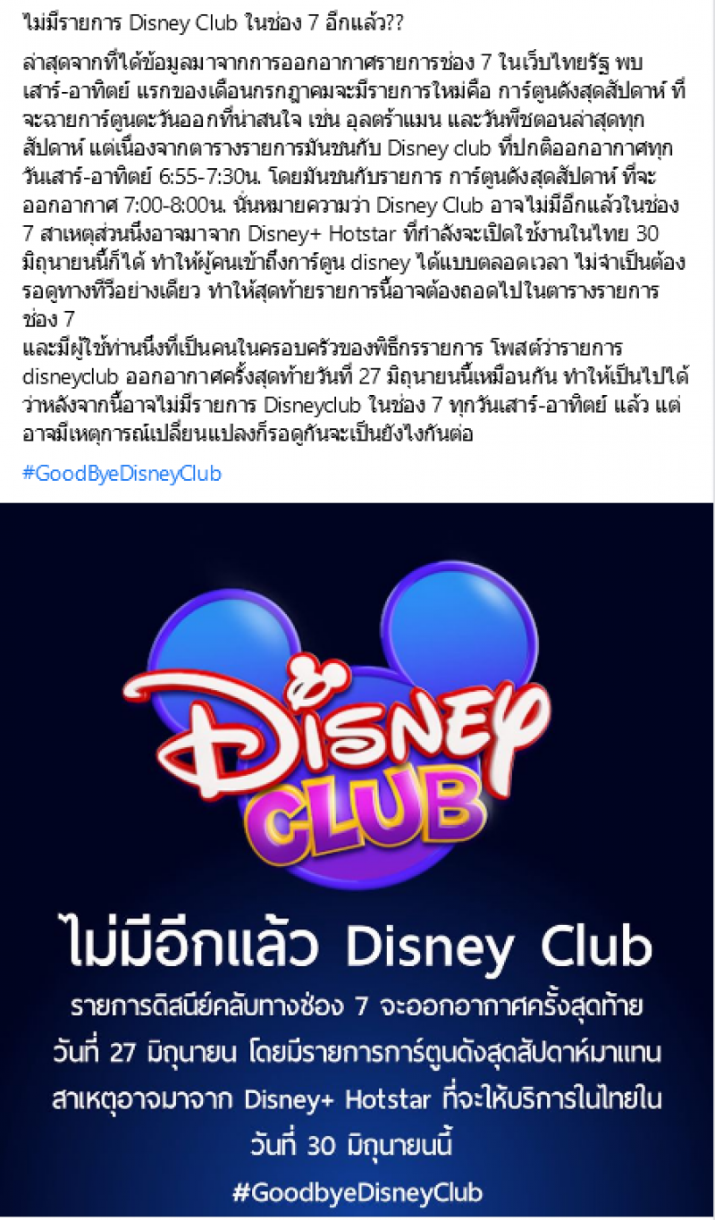 มีรายงานว่าในกลุ่ม Disney+ Hotstar Thailand ได้มีการเผยข้อมูลระบุว่า ไม่มีรายการ Disney Club ในช่อง 7 อีกแล้ว ล่าสุดจากที่ได้ข้อมูลมาจากการออกอากาศรายการช่อง 7 ในเว็บไทยรัฐ พบ เสาร์-อาทิตย์ แรกของเดือนกรกฎาคมจะมีรายการใหม่คือ การ์ตูนดังสุดสัปดาห์ ที่จะฉายการ์ตูนตะวันออกที่น่าสนใจ เช่น อุลตร้าแมน และวันพีชตอนล่าสุดทุกสัปดาห์