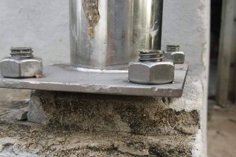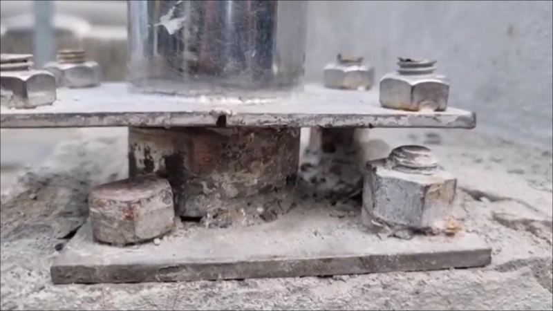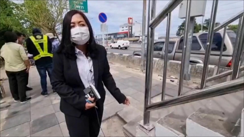 จากการตรวจสอบพบว่าเป็นสะพานลอยข้ามขนาดความกว้างประมาณ 1.5 เมตร มีราวจับเป็นสแตนเลสทั้ง 2 ข้าง มีส่วนหลังคากันฝนตลอดสะพานลอย ชื่อโครงการก่อสร้างสะพานลอยและทางลอด สัญญาเลขที่ นบ.5/2564 ลงวันที่ 14 ม.ค.64 เป็นส่วนเพิ่มเติมโครงหลังคา ต่อเติมจากสะพานลอยเดิม พบว่าที่ตีนเสาโครงหลังคาจำนวนหลายจุด ปูนซีเมนต์ถูกกระเทาะออก ทำให้เห็นว่าแผ่นสแตนเลสลอยจากพื้น และไม่มีแกนน็อต ตรวจสอบเห็นเฉพาะหัวน็อตติดหลอกไว้เท่านั้น โดยที่พื้นสะพานด้านล่างมีแผ่นตีนเสาเก่ายึดน็อต 4 ตัว ติดกับเสาสแตนเลสใหม่ไว้พร้อมการเชื่อมต่อ
