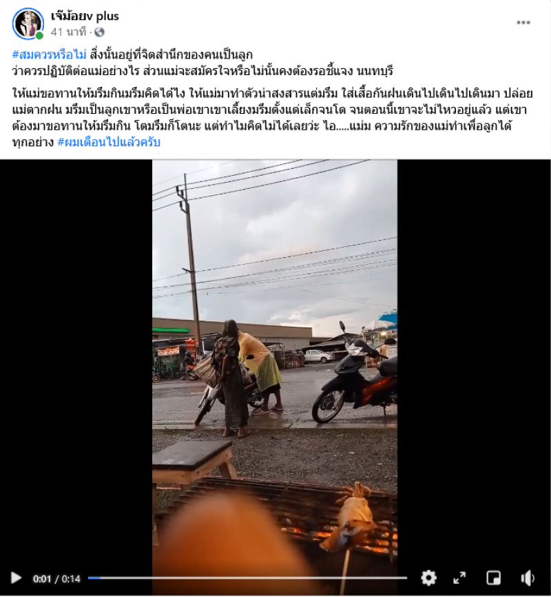 วันที่ 1 กรกฎาคม เฟซบุ๊กเพจ เจ๊ม้อยv plus ได้มีการลงเรื่องราวร้องเรียน จากชาวบ้านโดยระบุว่า #สมควรหรือไม่ สิ่งนั้นอยู่ที่จิตสำนึก ของคนเป็นลูก ว่าควรปฏิบัติต่อแม่อย่างไร ส่วนแม่จะสมัครใจหรือไม่นั้นคงต้องรอชี้แจง นนทบุรี