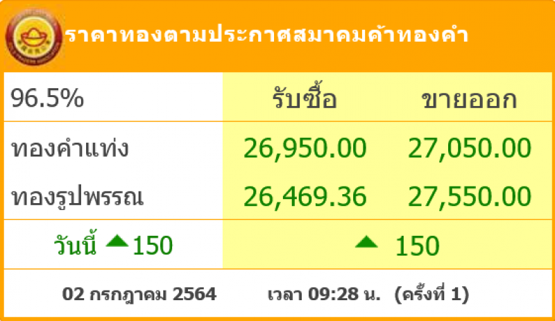 วันที่ 1 กรกฎาคม 2564 สมาคมค้าทองคำรายงาน ราคาทองไทย ครั้งที่ 1 เมื่อเวลา 09:24 น. โดยราคาทองล่าสุดราคานั้น ได้มีการปรับขึ้น 150 บ. ส่งผลทำให้ราคาวันนี้ทองคำแท่ ง รับซื้อบาทละ 26,750 ขายออกบาทละ 26,850 บาท ส่วนทองรูปพรรณ รับซื้อบาทละ 26,272.28 ขายออกบาทละ 27,350บาท