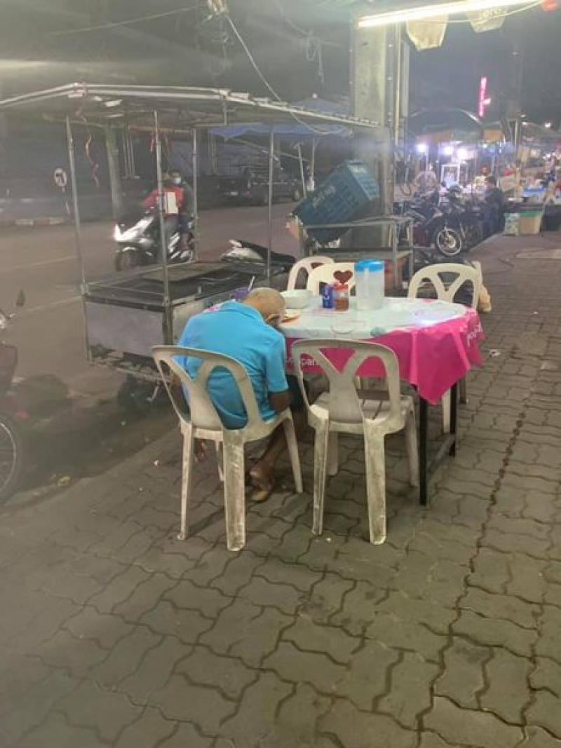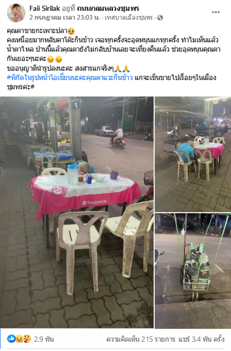 เมื่อวันที่ 2 กรกฎาคมที่ผ่านมาผู้ใช้เฟซบุ๊กชื่อ Faii Sirilak ได้มีการโพสต์ภาพคุณตาท่านหนึ่ง ที่นั่งหลับอยู่โต๊ะอาหาร โดยระบุว่า คุณตาขายกะเพาะปลา คงเหนื่อยมากหลับคาโต๊ะกินข้าว เจอทุกครั้งจะอุดหนุนแกทุกครั้ง ทำไมเห็นแล้วน้ำตาไหล ป่านนี้แล้วคุณตายังไม่กลับบ้านเลยจะเที่ยงคืนแล้ว ช่วยอุดหนุนคุณตากันเยอะๆนะคะ ขออนุญาตินำรูปลงนะคะ สงสารแกจริงๆ #พิกัดในรูปหน้าโอเชี่ยนนะคะคุณตาแวะกินข้าว แกจะเข็นขายไปเรื่อยๆในเมืองชุมพรค่ะ